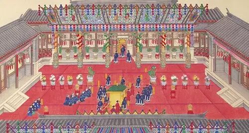 《纳采礼筵宴图》十五,鸿胪寺官引众官至堂下,以后父为首,行三跪九叩礼。