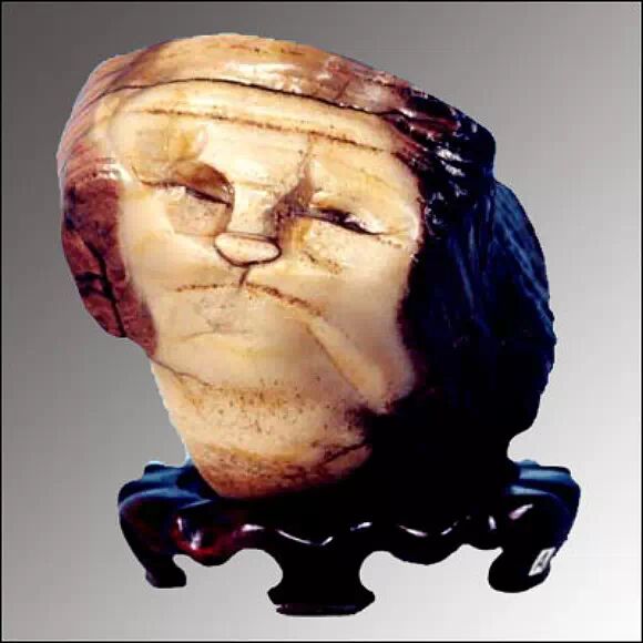现收藏于银川的一位赵姓藏家手中,属戈壁石类。这块奇石约为成人拳头大小,酷似一位西洋老妇人头像,鼻子、嘴巴、皱纹、头发宛如真人,是能够形成人脸状的奇石,而且眼睛、嘴、下巴等器官的比例与真人的比例非常近似,不得不说这是一个自然创造的奇迹。这块石头规格为8.5×8×6.9cm,重1.3kg,专家估价为1亿。