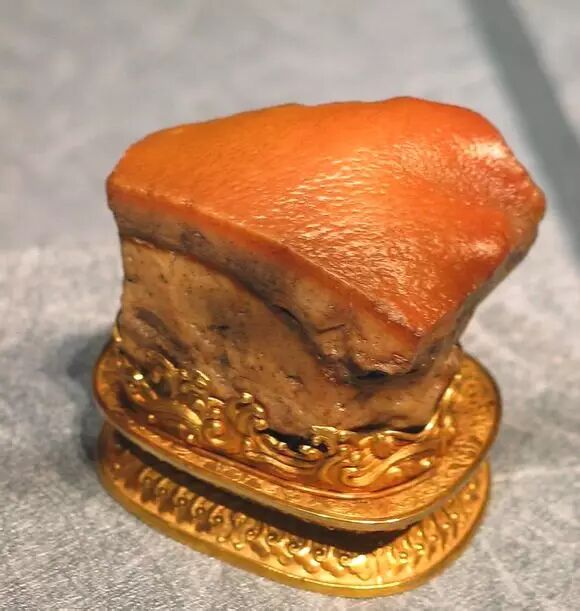 1、《东坡肉形石》 出自内蒙阿拉善左旗,在清朝康熙年间供入内府,现为中国四大奇石之一。现收藏在台北故宫,此奇石是一块天然的石头,色泽纹理全是天然形成,如鸡蛋大小,其矿物化学成分是二氧化硅。此东坡肉形石色泽纹理全是天然形成,看上去完全是一块栩栩如生的五花肉块,“肉”的肥瘦层次分明、肌理清晰、毛孔宛然,相当逼真,现它与翠玉白菜、毛公鼎并称台北故宫的“镇馆三宝”。其规格为5.73×6.6×5.3cm,重0.52kg,专家估价为无价。