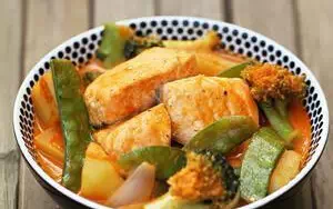 虽然很少人在吃三文鱼的时候选择咖喱。但是两者却是完美的组合。咖喱的姜黄色素和三文鱼中的DHA都具有很强的抗癌防癌的作用。两种食物结合就有双重的抗癌作用。三文鱼的DHA也非常有利于人体利用姜黄素。