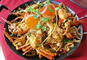 4、锅里倒入油,烧热,把沾了干粉的毛蟹放到锅里炸至变色,取出备用;