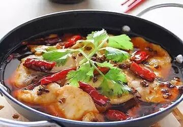 7、另起一锅把五香油倒一部分在锅里,放入花椒和干辣椒段,用小火炸出香味,辣椒的颜色稍变就关火,随即将热油浇在鱼片上即可;