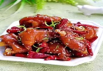 13、倒入收好汁的猪脚入锅内。加入一大匙清水,用小火翻炒至水收干,撒上白芝麻即可;