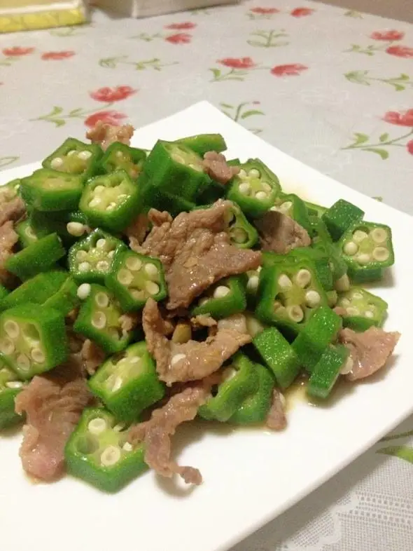 3.炒锅下油,大火加热。洋葱下锅爆香,下牛肉、酒,拌炒片刻。随后加入西红柿酱、西红柿、480毫升水、酱油、糖、盐,煮沸后,改小火焖煮约1小时,至牛肉熟透。加入秋葵,煮熟。以太白粉水勾芡,即可上桌。