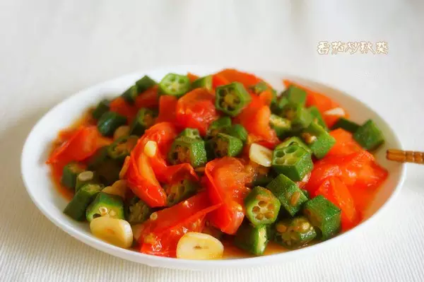 锅热倒入番茄翻炒,炒出番茄汁后,最倒入黄秋葵翻炒;