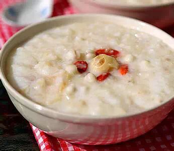 小零嘴:糯米百合甜杏粥。糯米100克,百合30克,甜杏仁20克洗净同煮为粥。