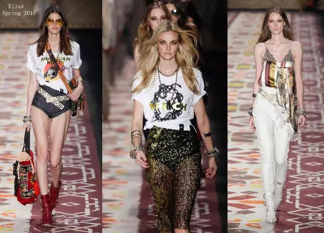 从服装到配饰,都是多元化搭配。T恤印花时尚又大气,首饰项链夸张前卫, 腰带也选用钉珠突出时髦帅气。还有蕾丝金边裤,刺绣手提包,组成了多元化搭配时尚。