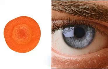 2、切开的胡罗卜就像人的眼睛,有瞳孔、虹膜以及放射的线条。科学研究表明,大量的胡萝卜素能促进人体血液流向眼部,保护视力,让眼睛更明亮。