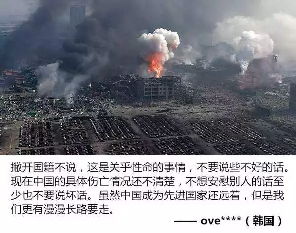 天津爆炸事故发生以来,出现了各种各样的说法和观点。我能做的并不多,连志愿者都满了,想帮忙帮不上,不过我们要相信政府,当家的前方线报表示物资并不缺, 并且不要相信朋友圈的谣言,多关注官方信息, 于是我整理了国内外网友一些带有思考、相对理性的评论(观点未必一致,我不喜欢只有一种声音),希望能引发大家沉思,避免悲剧再度发生。