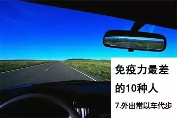 有车一族越来越多,大约 25 %的人已经丢掉了走路的习惯。研究发现,整天开车到处走的人比喜欢走路的人,生病的时间长 2 倍。专家称,每天进行 30 分钟的有氧运动(如快走),免疫系统的工作效率更高。