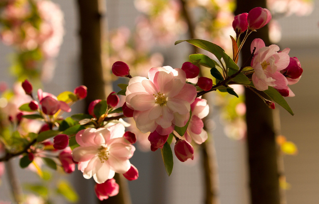 海棠是浅浅的红,红得“乐而不淫”,淡淡的白,白得“哀而不伤”,又有满树的绿叶掩映着,秾纤适中,像一个天真、健美、欢悦的少女,同是造物者最得意的作品。