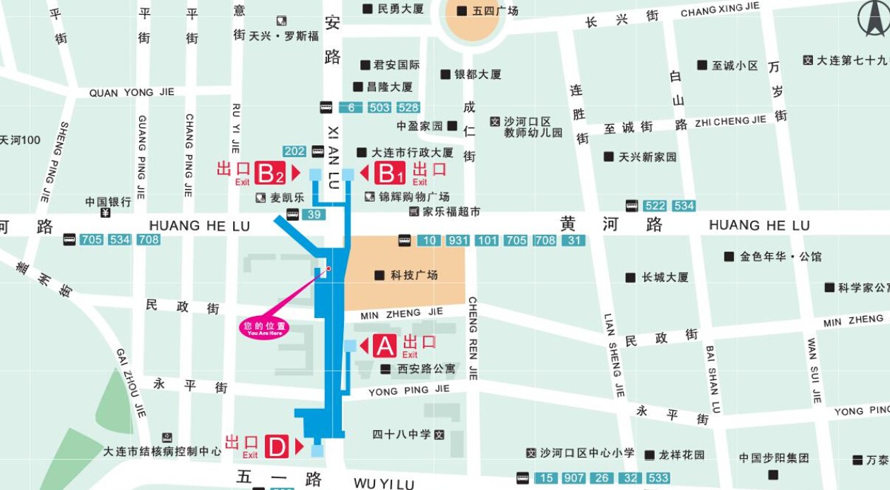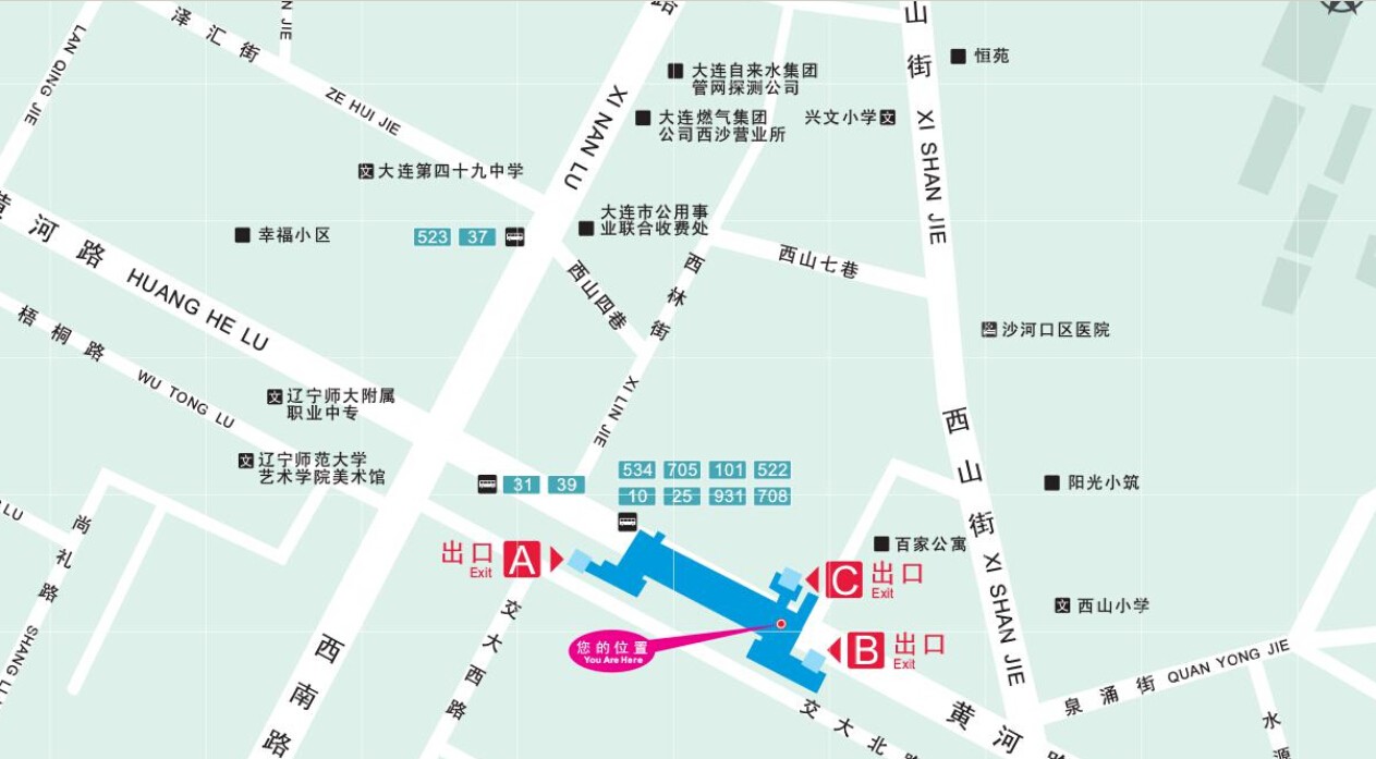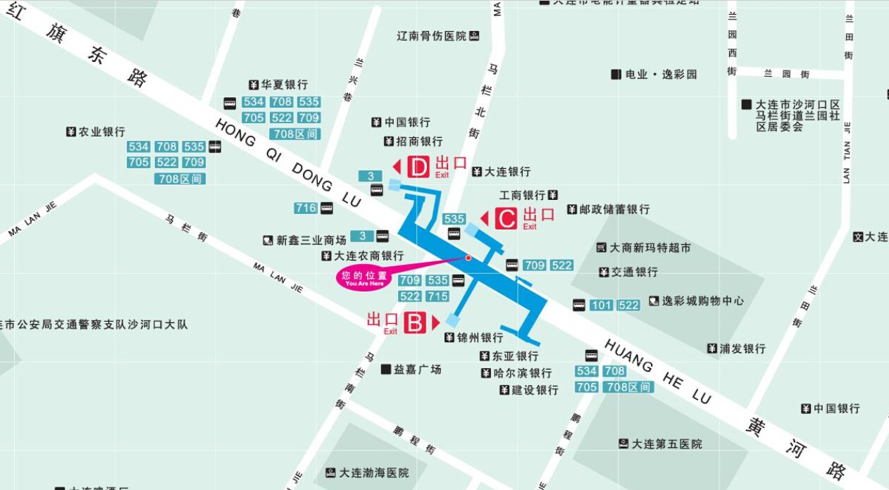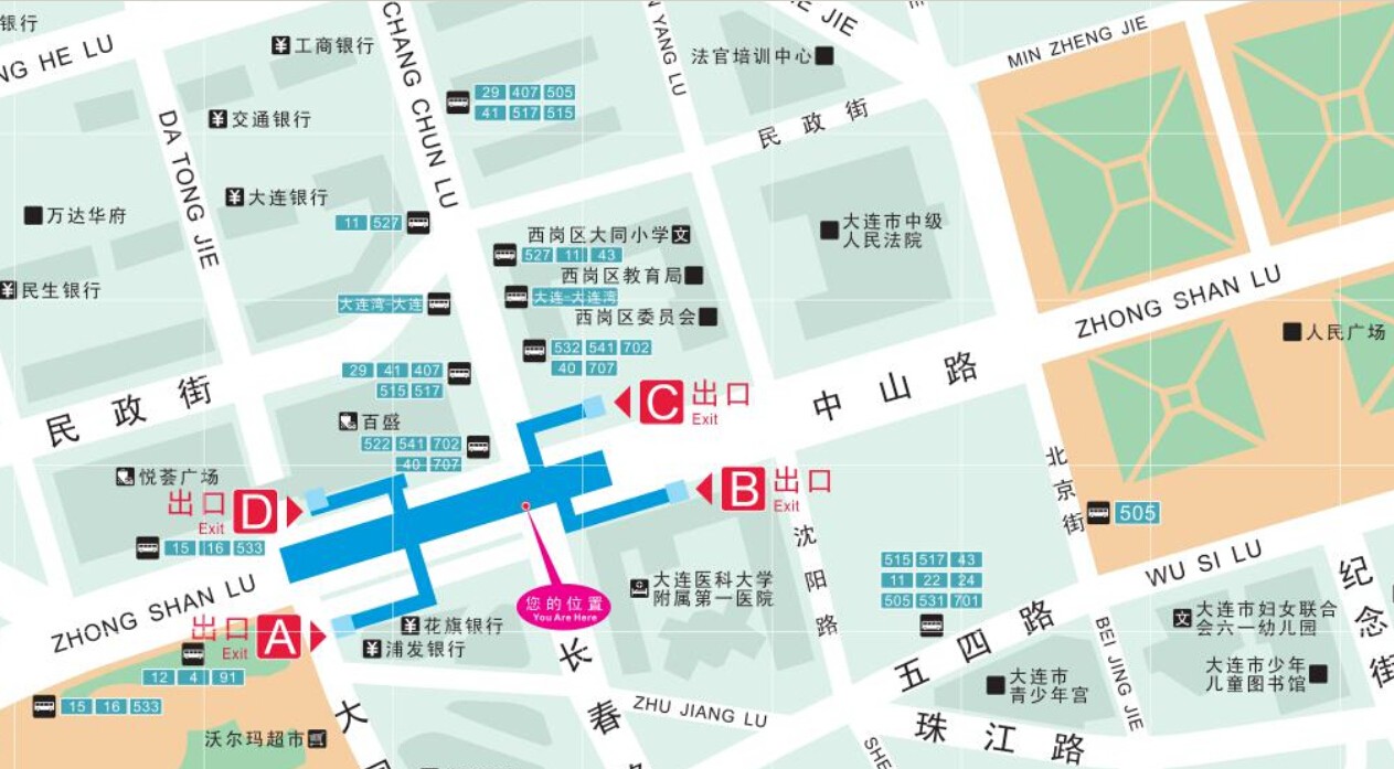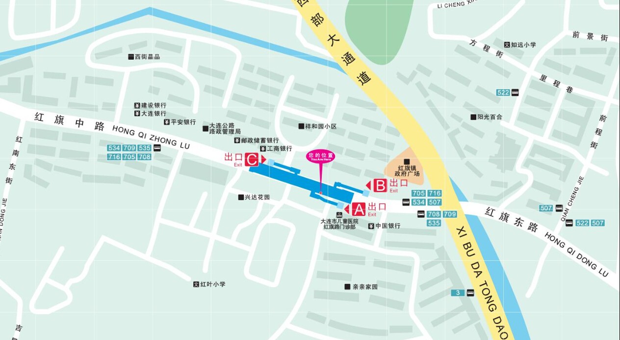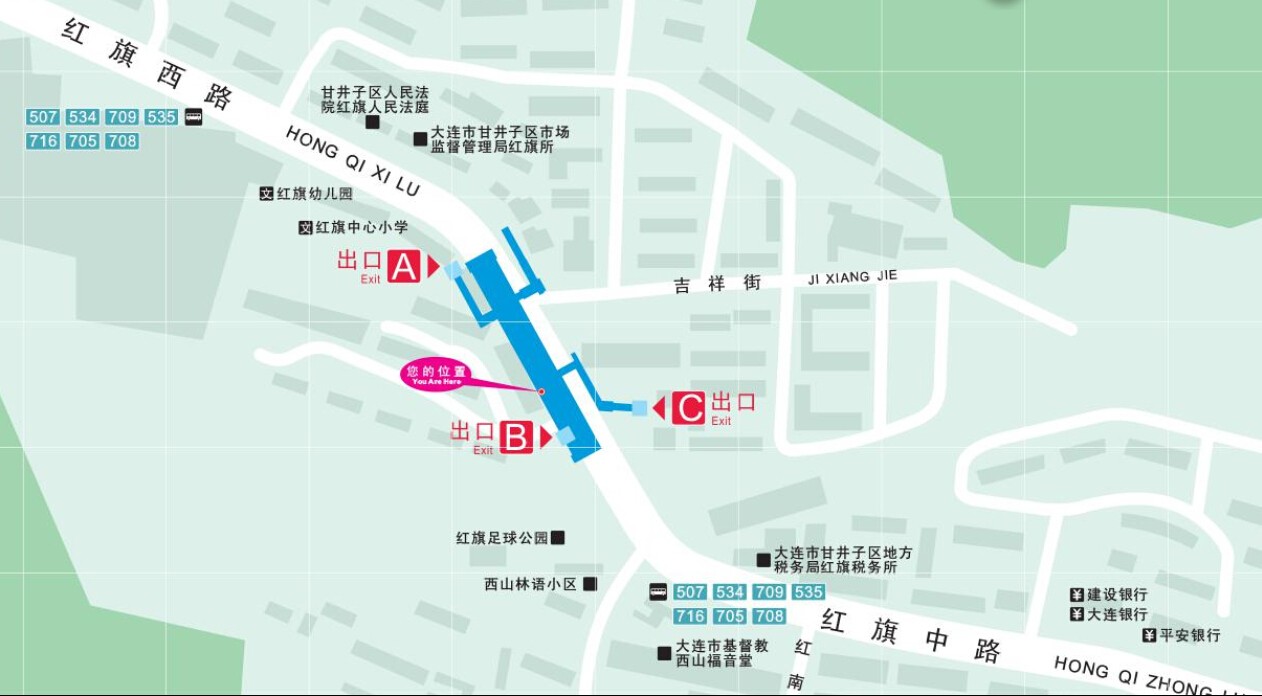 1号出入口位于车站西南角,大连市民健身中心北侧;