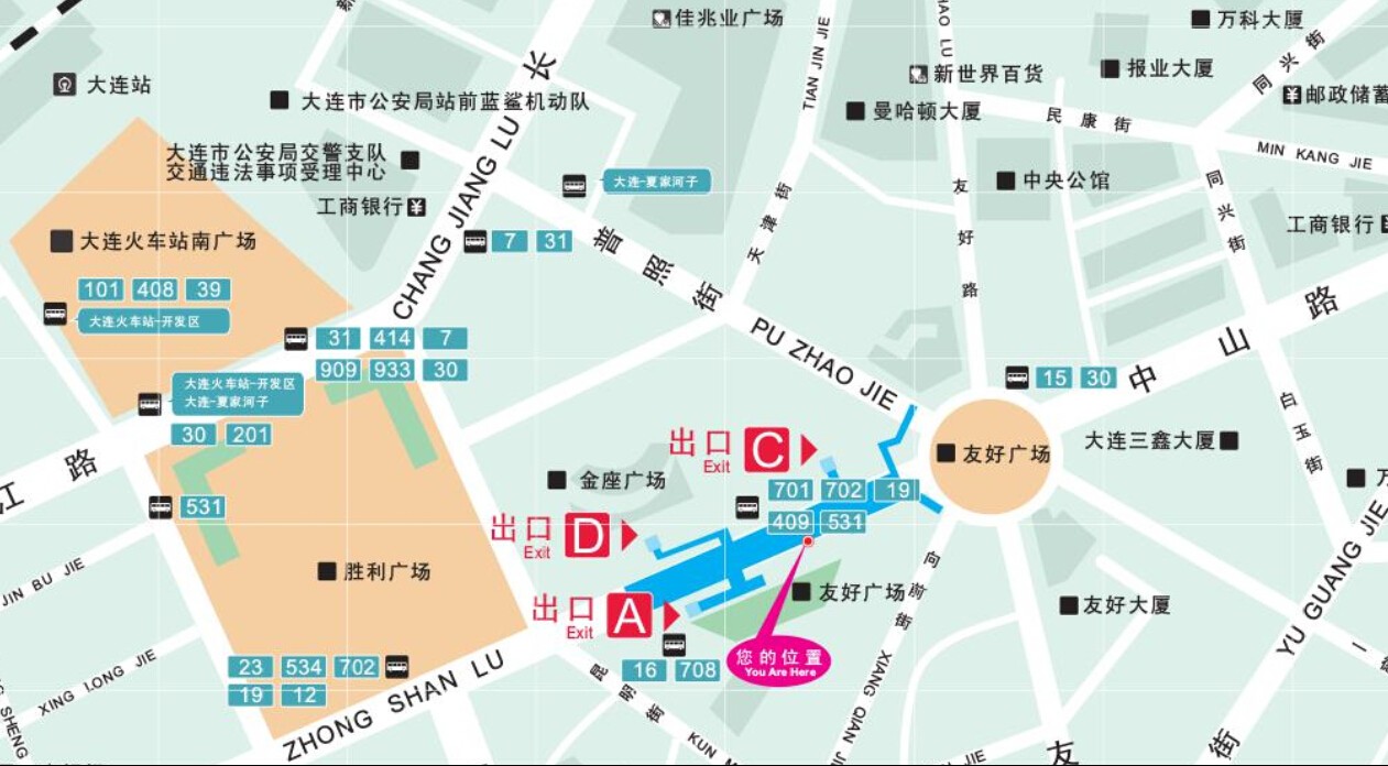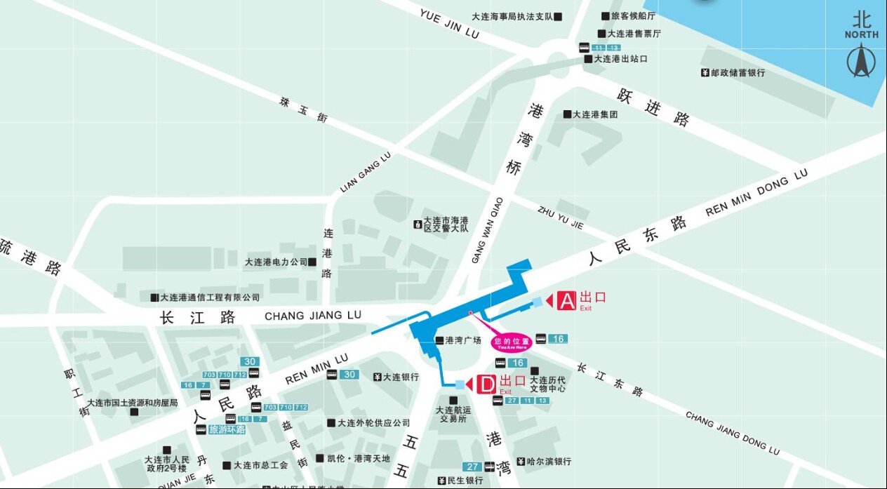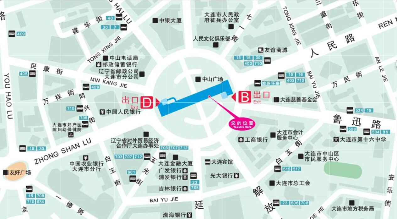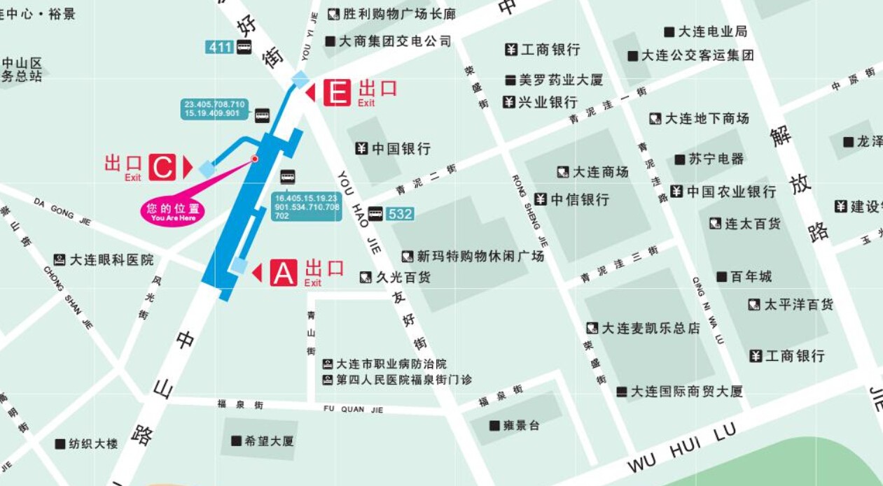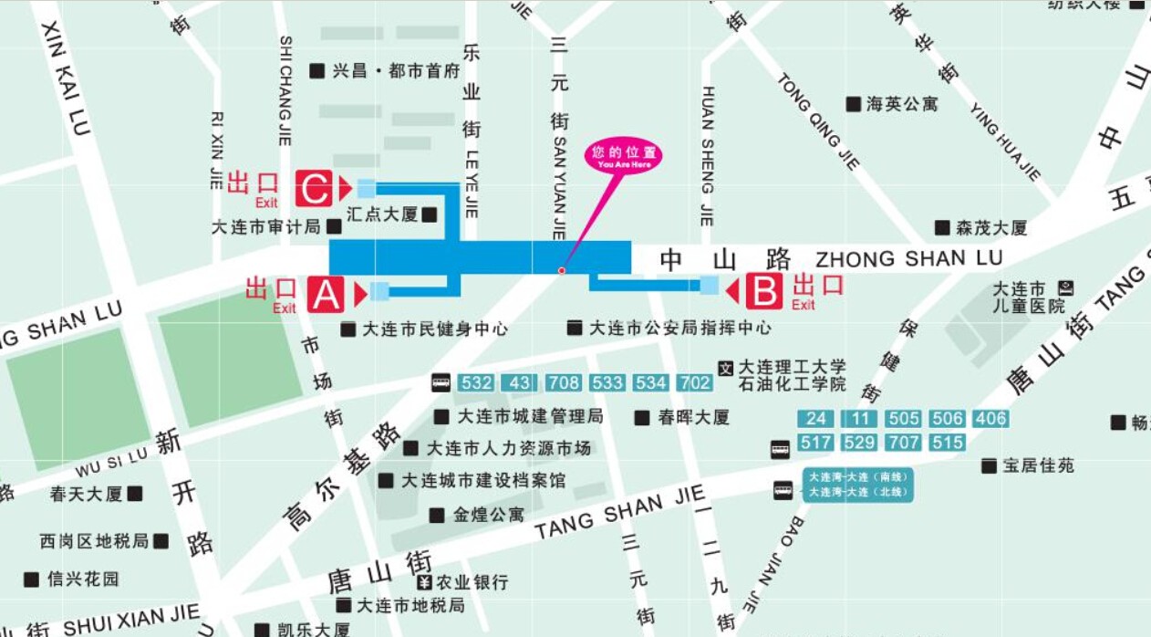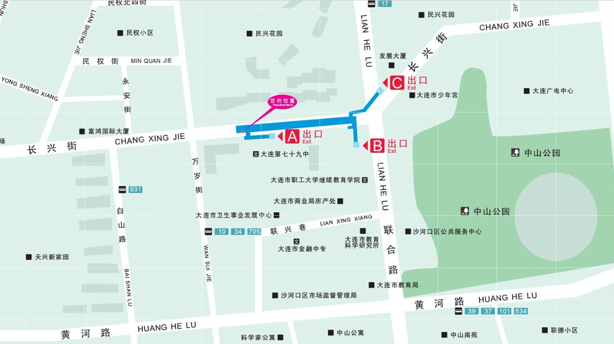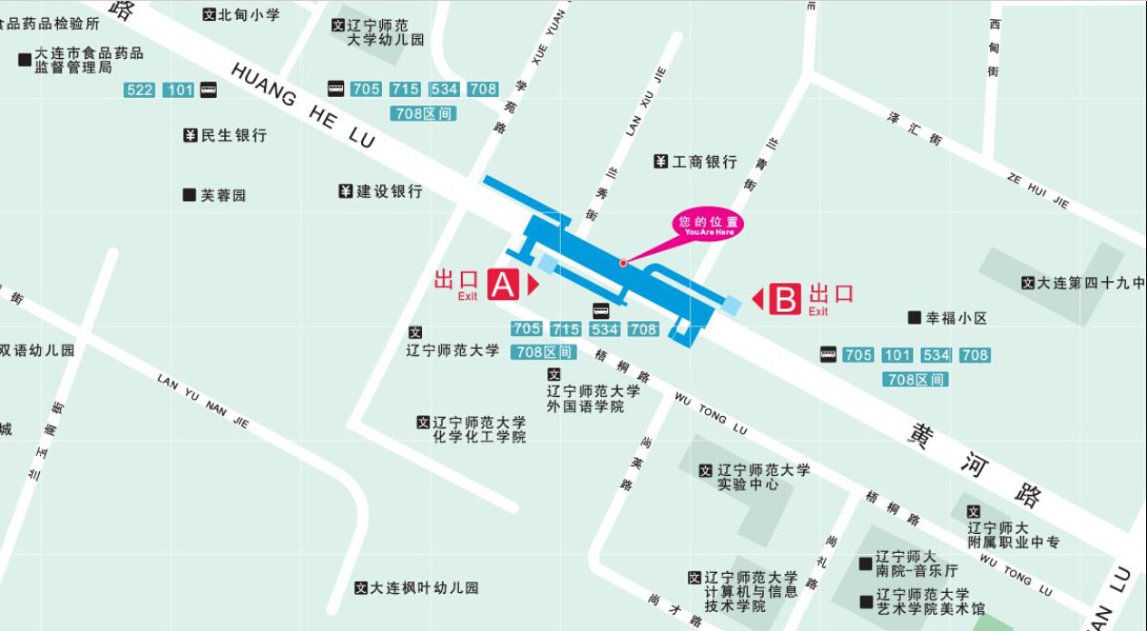 1号出入口位于车站西南角,大连市民健身中心北侧;