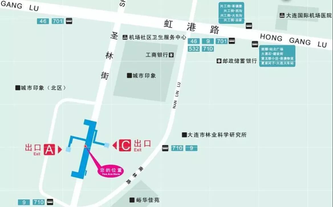 车站周边设有公交车站机场站,9路、46路、532路、701路、701路加车、710路、908路、大黑石-建设街、大连火车站-夏家河子、大连站北-旅顺、第五郡-姚家、兴工街-大东沟、兴工街-富华广场、兴工街-革镇堡、兴工街-西沟等线路供换乘。
