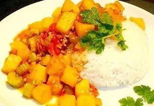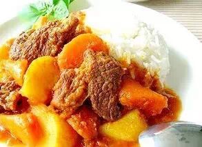 6.加清水(比全部淹没食材还要多一点),大火煮开后中火慢炖,中途加盐调味。牛腩酥烂,汤汁浓稠即可(中途如需加水,加开水较好)。炖好的番茄牛腩浇在热米饭上。