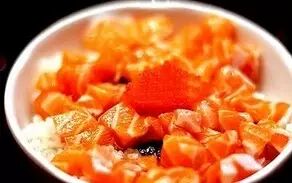 5.适量牛油果切片放在饭上,盖上生剁的三文鱼头。淋上酱油就可以开吃啦。