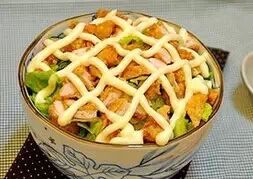 5.最后放一层炸鸡小块,挤上沙拉酱。