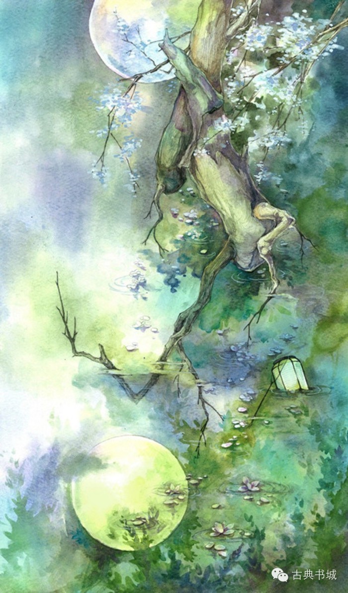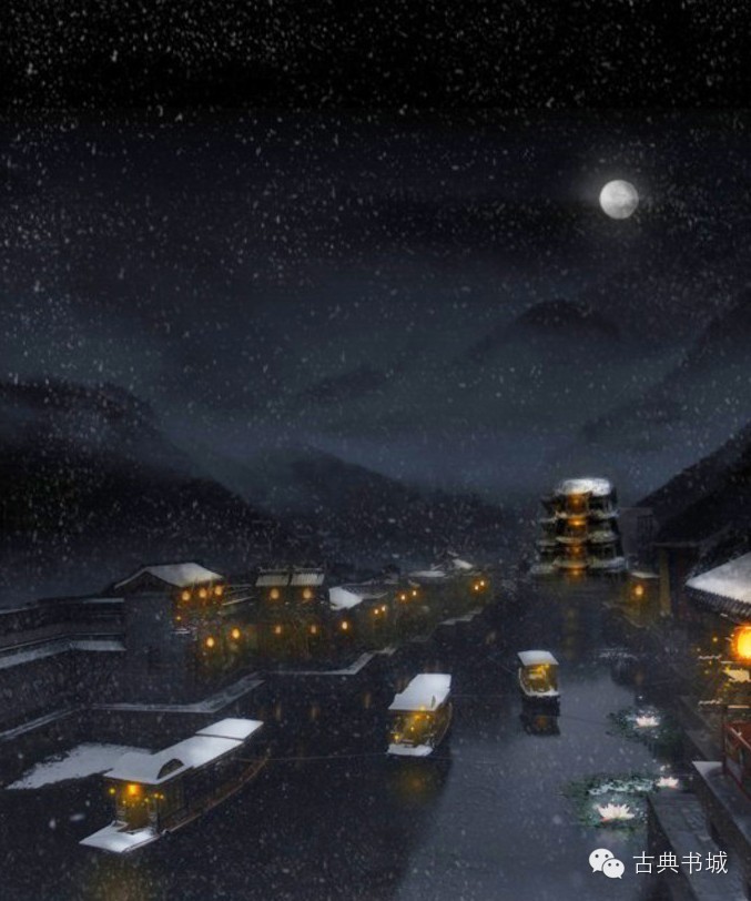 ▶古典君:“月光如水”,波柔色浅,宛若有声,静中见动,动愈衬静。诗人由月而望到水,只见月影倒映,恍惚觉得幽深的苍穹在脚下浮涌,意境显得格外幽美恬静。整个世界连同诗人的心,好像都溶化在无边的迷茫恬静的月色水光之中。