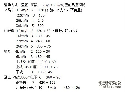 主要户外运动方式每小时消耗的热量(Mets系数×(体重+负重)=卡路里)
