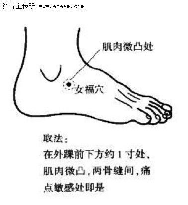 位置在外踝前侧约1寸处,肌肉微凸,极易辨认,可以用压痛法取准,哪里最敏感最痛就压哪里,每天指压一次,一次7到8分钟,就是用手指头按在上面,二十天一个疗程,可以使得妇女在月经过程中得到快乐和舒适,同时还有强腰壮腿的功能。