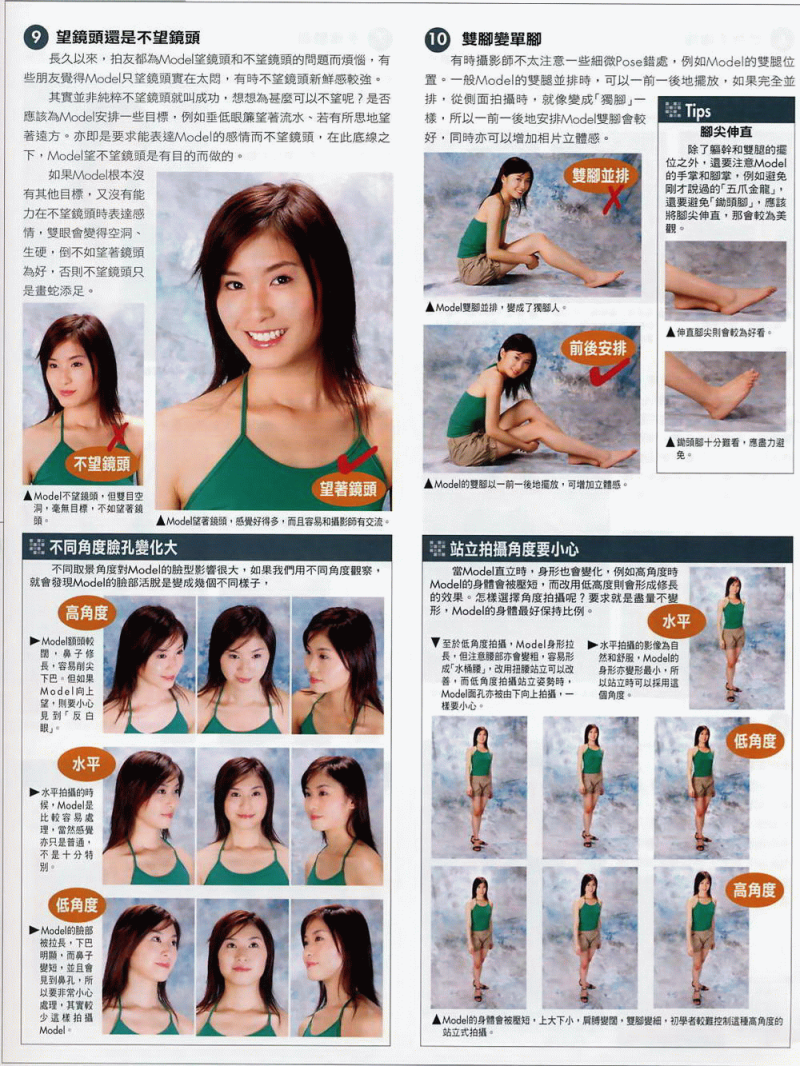 1. 头部和身体忌成一条直线。两者如成直线,难免有呆板之感。因此,当身体正面朝向镜头时,头部应该稍微向左或向右转一些,照片 就会显得优雅而生动;同样道理,当被摄者眼睛正视镜头时,让身体转成一定的角度,会使画面显得有生气和动势,并能增加立体感。