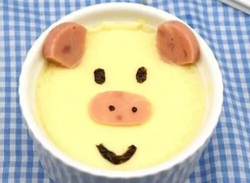 6、把切好形状的火煺片和紫菜放在蒸好的鸡蛋上面,可爱的小猪就出现了