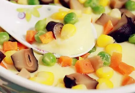 鸡蛋、彩蔬(胡萝卜粒、香菇粒、玉米粒、碗豆粒)