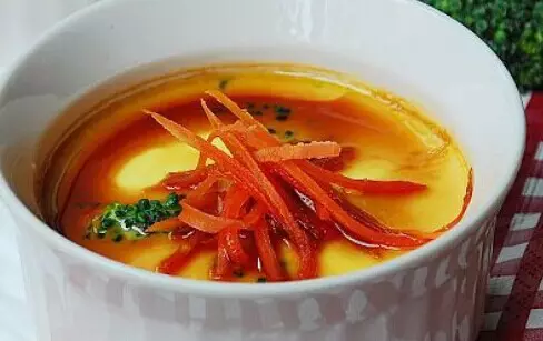 4、胡萝卜去皮擦丝,放入滚水中汆烫,捞出沥干水分。将生抽、蚝油、香油拌匀制成调味汁,淋在蒸好的鸡蛋上,搭配上胡萝卜丝即可