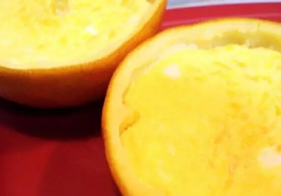 3、橙子对切两半,用手和勺子在橙子里挤呀搅呀,把橙汁儿和橙肉都挤到装有蛋液的碗里(其实也不用真的挤太干净,反正蛋液一会儿也得再倒进橙子皮里,所以用勺子掏橙肉的时候不要太过用力把橙皮儿弄破了)