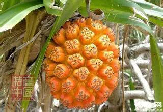 山菠萝为小灌木,原产东南亚。我国广东、广西和云南均有出产。喜生于海边和沿海沼泽地区。果实每年 5~6 月成熟,内部种子可食用,味道香甜,口感与花生相似。果大,单生,近球形,熟时橙红色,由 50~70 或更多的倒圆锥形、稍有稜角、肉质的小核果集合成之聚合果,球形,直径可达 20 公分,形似"菠萝"(凤梨),故有"野菠萝"之称。