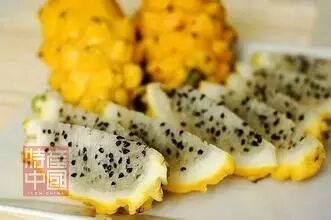 黄龙果:是火龙果品种中极为珍贵的品种,其果皮果肉色泽为黄皮白肉,未熟果为绿色,果皮上有长而尖的利刺,全熟后,细刺会脱落。果实糖份贮存充足,且果实长得慢,果肉细致无比,甜度皆在18%以上,略带些许香味,为火龙果家族中之极品。味道像初恋情人那样刻骨铭心。
