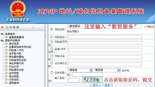 5.在网站名称处输入”数贸服务“,获取验证码,系统提示验证正确,提交。