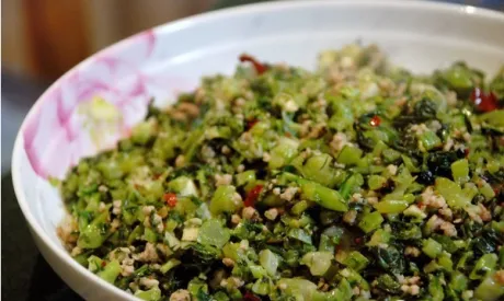 现成的肉末用生抽和盐拌好,下油炒。肉变色后放袋装雪菜,炒香了就差不多了。其他调料可放可不放,有时间的话切点葱,放点干辣椒碎。