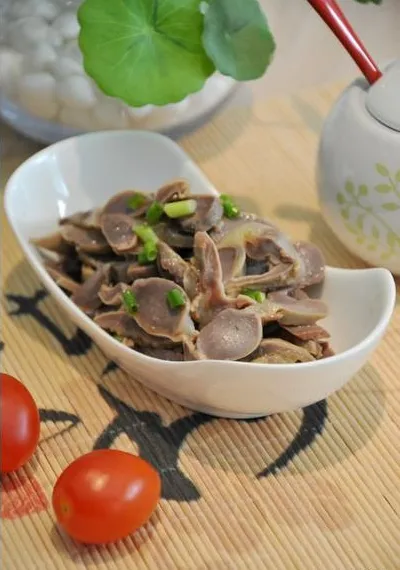 烧油,放干辣椒段炸香脆,趁热把所有的鸡胗片,葱丝和辣椒丝,蒜末香菜神马的都扔里爆一下味道。加点少许调味的酱油醋白糖就可以吃了!