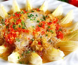 小半碗水,生抽,糖(可以多放点),少许盐味精,放点海米,再加点香油,等蒜油爆香后倒入碗里,拌匀。粉丝铺盘子里,最好切成小段,然后浇上面的汁。把白菜心切成2厘米左右小段,铺粉丝上,上火蒸十分钟,搞定!