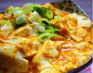 之所以叫伪,是因为正宗的应该拿真正的蟹肉蟹黄来做,但是我们的口号是简单方便,所以咸鸭蛋黄一个代替~中小火给油加热,煮熟的咸鸭蛋剥出黄一个扔锅里,拿铲子铲碎不停翻炒,看见泡泡冒的很多很大的时候(大约1、2分钟)加水和一盒内酯豆腐咕嘟着,把咸蛋白拿刀切碎。东西都是熟的,锅开个三五分钟就可以了,把蛋白扔锅里,少许勾个芡,高兴的话可以放些香菜碎和黑胡椒粉。