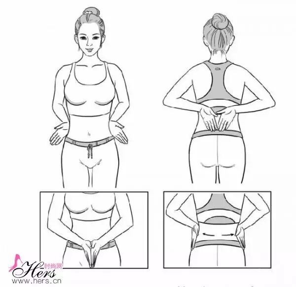 双手合十,指尖向前,掌跟顶住肚脐用力向两侧推,推到腰的两侧时,手背与后腰的命门穴(肚脐跟后腰正对的位置)相对。