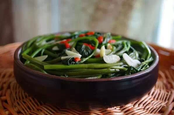 1、蒜茸番薯叶:将嫩番薯叶茎洗净,放入沸水锅中焯后捞出用凉水冲凉,切成段。大蒜剥皮捣成茸。炒锅置火上,放素油烧至四成热,放人大蒜茸炒出香味,加入嫩番薯叶茎翻炒,加入精盐、炒入味,加入麻油,撒上剩余的蒜茸拌匀即成。