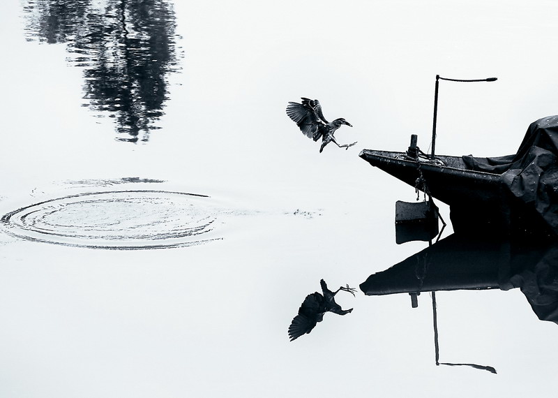 原片拍摄于浙江临安一个叫高坪的小山村,山村正好位于一个水库边,依山傍水,风景非常的优美。当我来到湖边时,只见湖面非常的宁静,犹如镜面一般,停泊在湖面上的一只小船和倒影都清晰可见,当时,感觉到小船在画面中的位置非常理想,就有一种拍摄的冲动,马上取景构图后就按下快门。记得拍摄时间约是下午的4点多钟,当时,太阳还处在画面比较高的位置,天空多云,光线不是很有力度,色温处于约5200K的标准色温。拍出来的照片影调正常,但光影效果不太理想,有些灰蒙蒙的。这样的照片如果是过去用胶片拍摄的,那就只好废弃了,而在今天,我们则能利用后期处理改变画面的基调,令其变废为宝,使之重生。