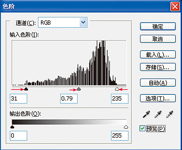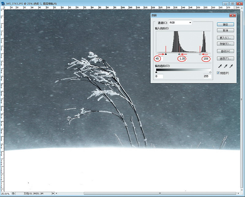 图6:调整色阶的中间小三角至0.68,点击确定,裁剪并存储图像即完成了《晨曲》的调整。该作品发表在《钱塘江》画册。