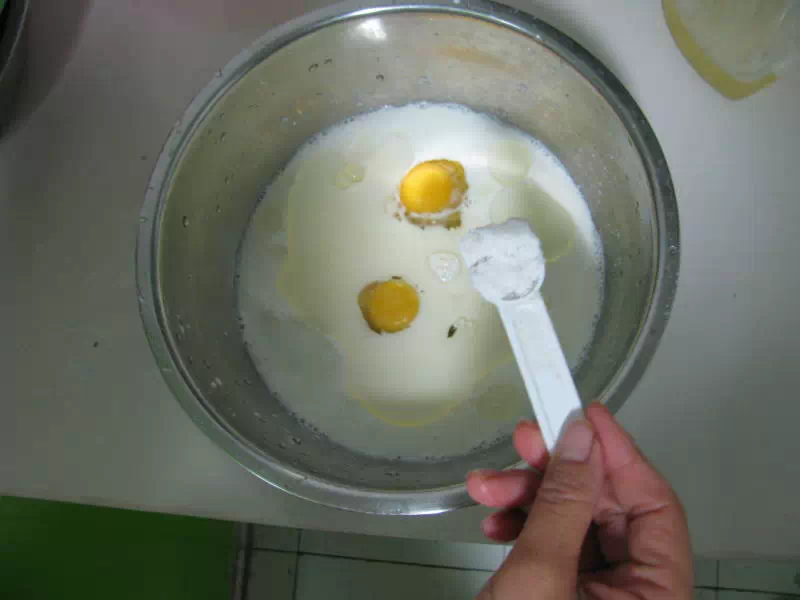 把牛奶、鸡蛋、油、盐、酵母放到一起搅拌一下(油的用量是平时炒菜的两倍左右就可以)放油太少炸出的油条发干。一个