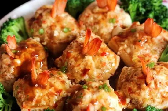 留虾尾是为了装饰,亲们做的时候根据自己的喜好来做;胡萝卜不要加多了,一点点就可以了,多了会抢虾的鲜美味道;豆瓣酱一点点就可以了,稍微提一下味,要剁细了再用;馅料装入豆腐后,用不锈钢勺沾点香油将表面抹光滑。