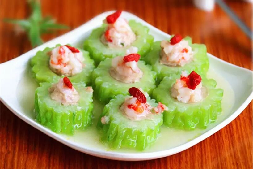 给苦瓜加点料,用猪肉末和虾肉一起镶入苦瓜中,中和了苦味,用清蒸的烹饪方法,原汁原味使得菜肴更加鲜美。