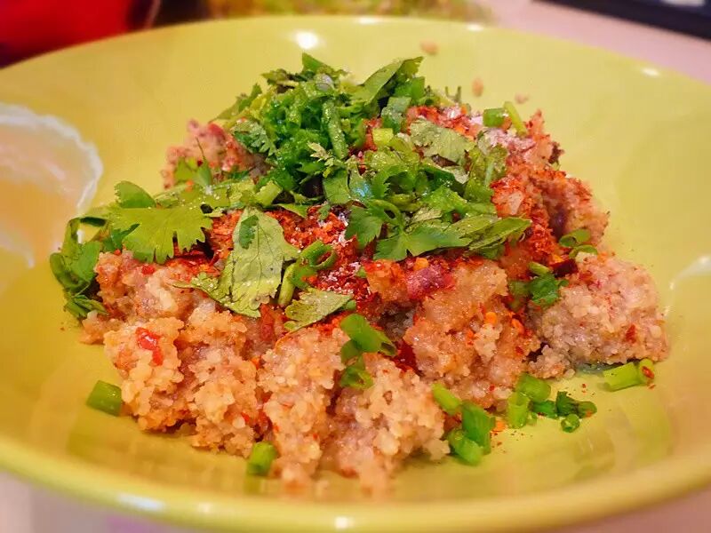 粉蒸牛肉,当地很有名的一道小吃,一般是搭配豆腐脑,或是搭配锅盔(白夹饼)。跟北方的米粉肉稍有点区别,川味粉蒸肉一定要加辣椒面,花椒面,香菜,码肉时也有一些特点。