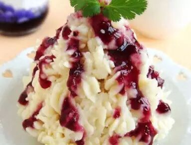 4、蓝莓酱加适量清水和蜂蜜调和均匀,一点要充分搅拌均匀,淋在山药泥上