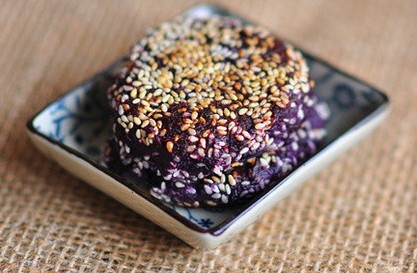 2、用勺将紫薯捣成泥,搓成丸子,再压成饼