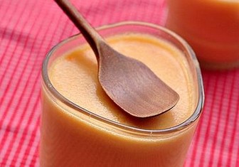 5、芒果打成泥,浇在放凉的双皮奶上,冷藏后更爽滑哦