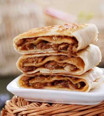 2. 面皮擀成一张大薄饼,分成四块,一块留空,其余的铺上肉馅儿,一层一层对折,把馅儿盖住,最后成一个扇形,封口。
