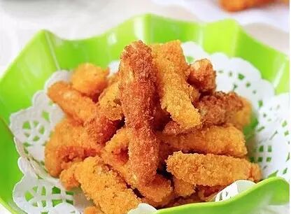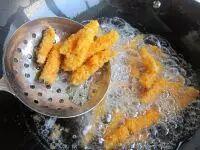 9.大火烧开油,下南瓜条下锅复炸一次捞出沥干油即可