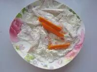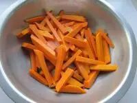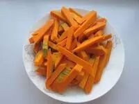 1.把南瓜去皮切条,去掉中心的瓜瓤,然后切成1厘米宽4厘米长的段